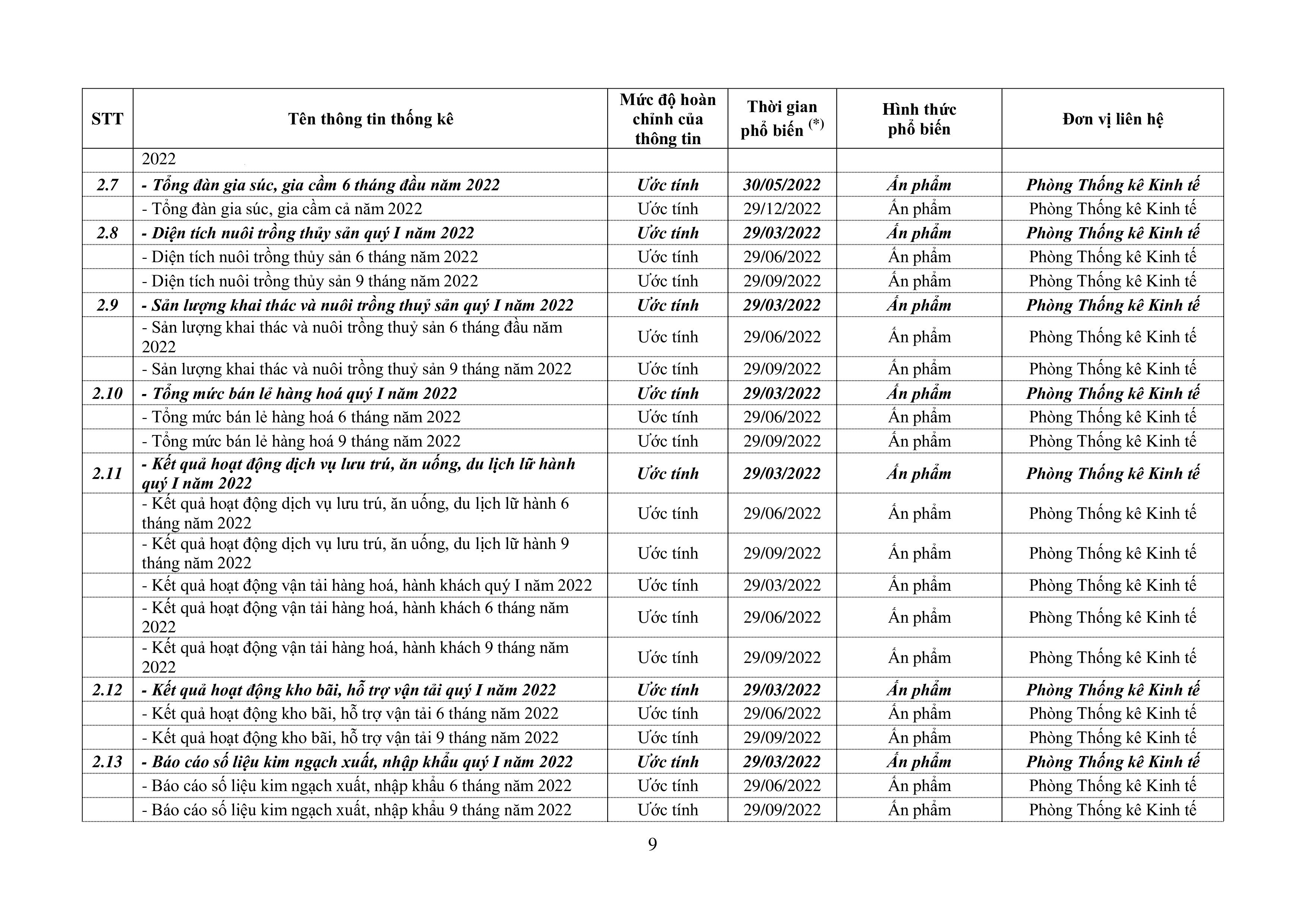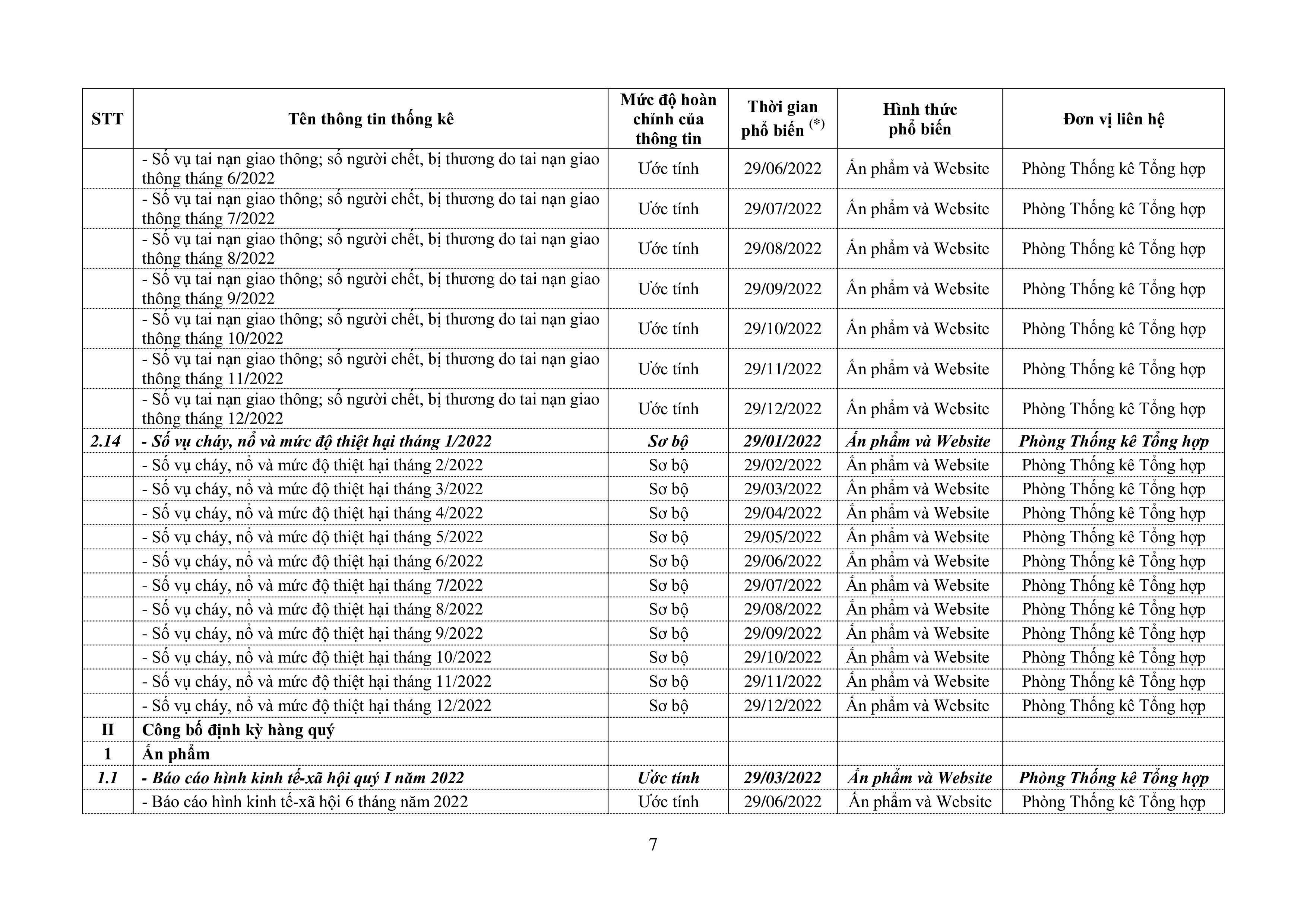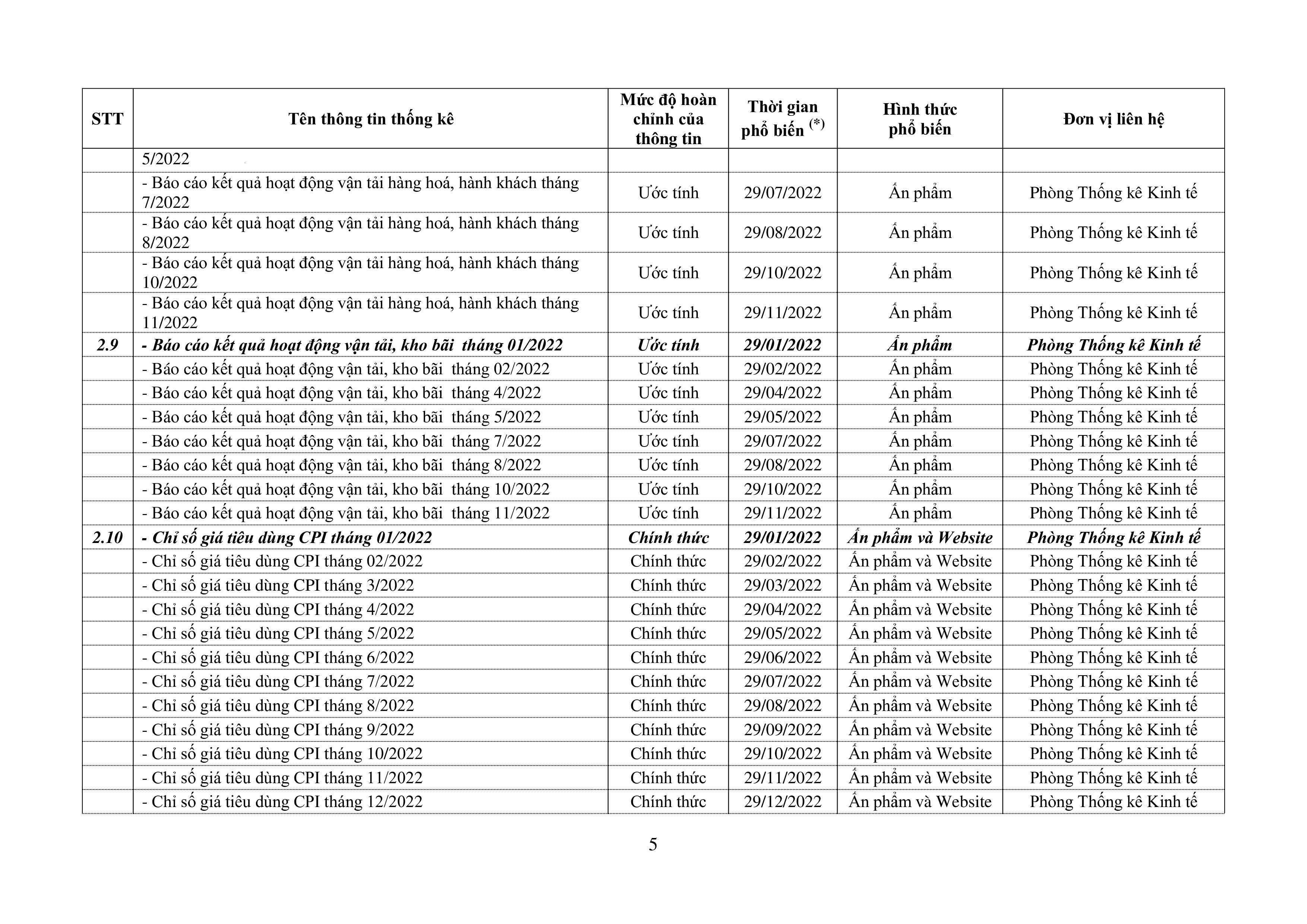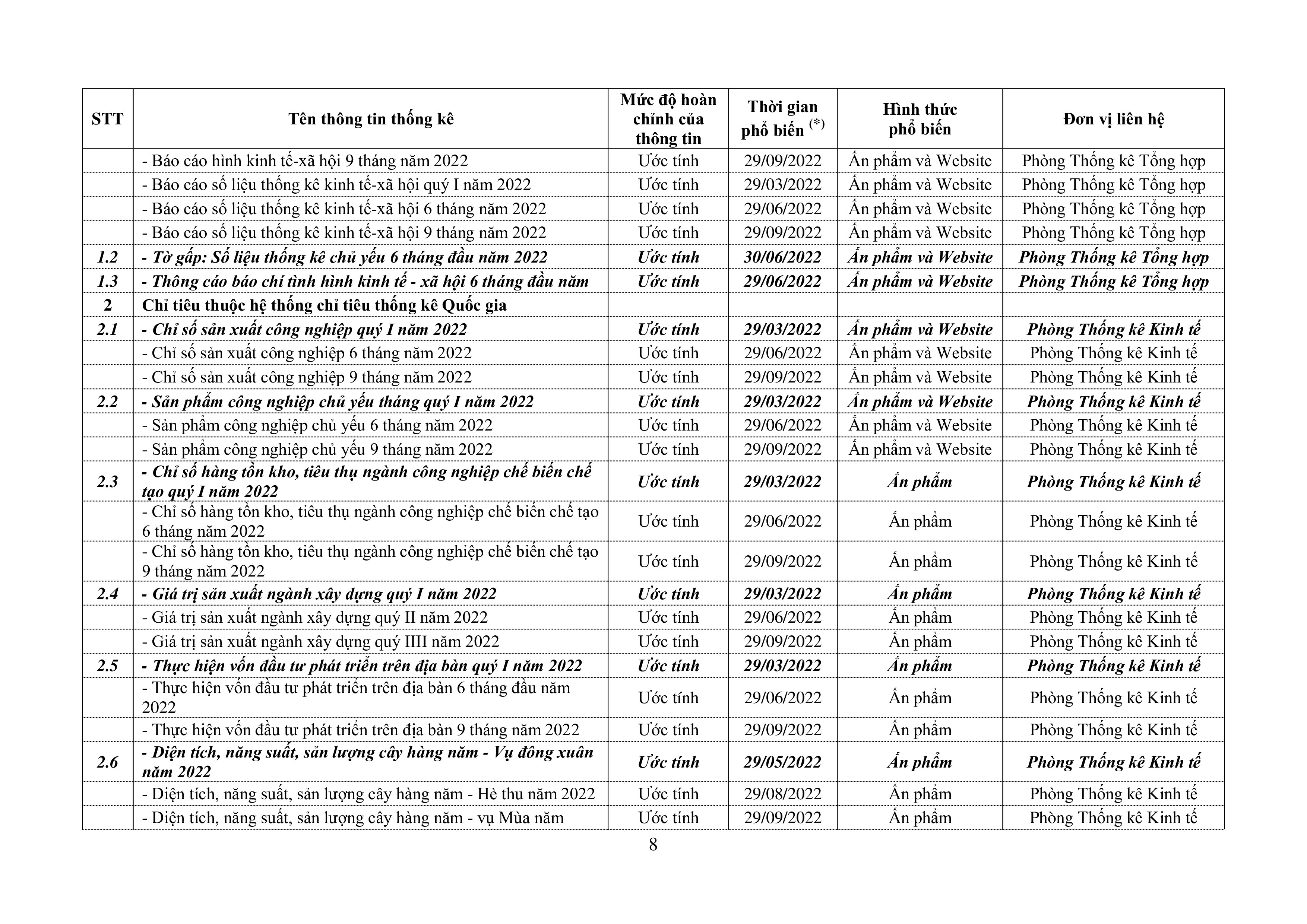 Lịch phổ biến thông tin thống kê năm 2022