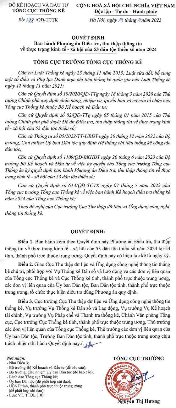 Quyết định số 628/QĐ-TCTK ngày 14/7/2023 của Tổng cục trưởng Tổng cục Thống kê ban hành phương án điều tra, thu thập thông tin về thực trạng kinh tế - xã hội của 53 dân tộc thiểu số