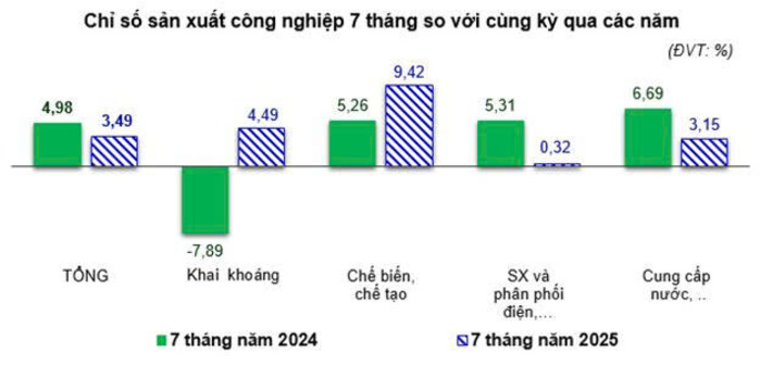 Chỉ số sản xuất toàn ngành công nghiệp (IIP) trong tháng ước tăng 1,68% so với tháng trước và tăng 11,73% so với cùng kỳ năm trước. Tính chung 7 tháng năm 2025, ước IIP tăng 3,49% so với cùng kỳ năm trước. Trong đó, ngành công nghiệp khai khoáng tăng 4,49%; ngành công nghiệp chế biến chế tạo tăng 9,42%; ngành sản xuất và phân phối điện, khí đốt, nước nóng, hơi nước và điều hòa không khí tăng 0,32%; ngành cung cấp nước, hoạt động quản lý và xử lý rác thải, nước thải tăng 3,15%.