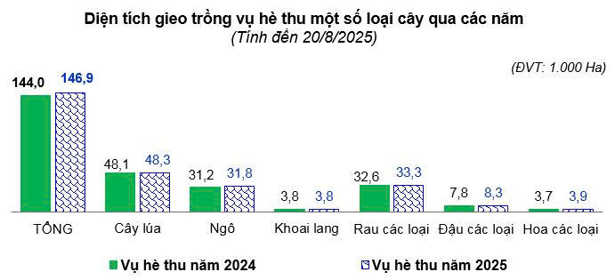 - Tiến độ sản xuất vụ hè thu: Tính đến ngày 20/8/2025, toàn tỉnh đã tiến hành gieo trồng vụ hè thu đạt 146.913,3 ha, tăng 1,99% so với cùng kỳ năm trước, trong đó: Lúa gieo cấy đạt 48.291,2 ha, tăng 0,36%; ngô đạt 31.789,0 ha, tăng 2,01%; khoai lang đạt 3.808,4 ha, tăng 0,76%; đậu các loại đạt 8.341,7 ha, tăng 6,55%; rau các loại đạt 33.296,7 ha, tăng 2,28%; hoa các loại gieo trồng đạt 3.865,5 ha, tăng 4,86% so với cùng kỳ năm trước.