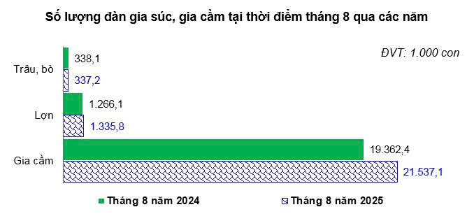 - Tổng đàn trâu toàn tỉnh ước đạt 26,4 nghìn con, giảm 2,91% so với cùng kỳ năm trước; đàn bò ước đạt 310,8 nghìn con, giảm 0,05%; đàn lợn ước đạt 1.335,8 nghìn con, tăng 5,50%; tổng đàn gia cầm ước đạt 21.537,1 nghìn con, tăng 11,23%, trong đó gà các loại 14.988,2 nghìn con, chiếm 69,59% tổng đàn gia cầm, tăng 12,09%. Sản lượng thịt hơi các loại ước 8 tháng năm 2025 đạt 202.689,9 tấn, tăng 6,60% so với cùng kỳ năm trước.