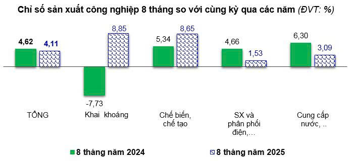 Chỉ số sản xuất toàn ngành công nghiệp (IIP) trong tháng ước tăng 2,40% so với tháng trước và tăng 9,64% so với cùng kỳ năm trước. Tính chung 8 tháng năm 2025, ước IIP tăng 4,11% so với cùng kỳ năm trước. Trong đó, ngành công nghiệp khai khoáng tăng 8,85%; ngành công nghiệp chế biến chế tạo tăng 8,65%; ngành sản xuất và phân phối điện, khí đốt, nước nóng, hơi nước và điều hòa không khí tăng 1,53%; ngành cung cấp nước, hoạt động quản lý và xử lý rác thải, nước thải tăng 3,09%.