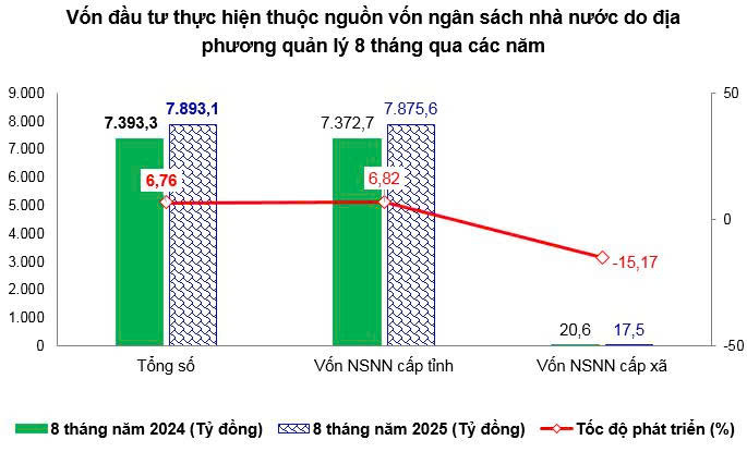 Tính chung 8 tháng năm 2025, vốn đầu tư thực hiện từ nguồn ngân sách nhà nước do địa phương quản lý ước đạt 7.893,1 tỷ đồng, đạt 49,70% so với kế hoạch, tăng 6,76% so với cùng kỳ năm trước. Trong đó vốn ngân sách nhà nước cấp tỉnh ước đạt 7.875,6 tỷ đồng, tăng 6,82%; vốn ngân sách nhà nước cấp xã ước đạt 17,5 tỷ đồng, giảm 15,17%.