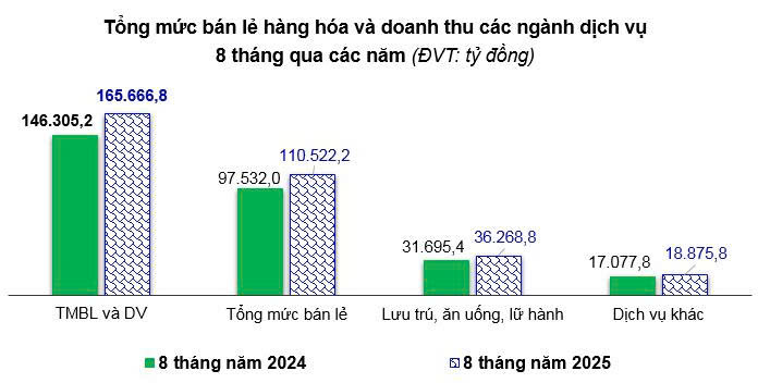 Lũy kế 8 tháng năm 2025, tổng mức bán lẻ hàng hóa và doanh thu các ngành dịch vụ ước đạt 165.666,8 tỷ đồng, tăng 13,23% so với cùng kỳ năm trước. Trong đó: tổng mức bán lẻ hàng hóa đạt 110.522,2 tỷ đồng, tăng 13,32% (lương thực, thực phẩm 50.754,6 tỷ đồng tăng 16,59%; đồ dùng, dụng cụ, trang thiết bị gia đình ước đạt 11.294,1 tỷ đồng tăng 13,61%; gỗ và vật liệy xây dựng 10.791,6 tỷ đồng tăng 11,48%; xăng, dầu các loại 14.718,7 tỷ đồng tăng 1,19%); doanh thu lưu trú, ăn uống và lữ hành ước đạt 36.268,7 tỷ đồng, tăng 14,43%; doanh thu các ngành dịch vụ khác ước đạt 18.875,9 tỷ đồng, tăng 10,53%.