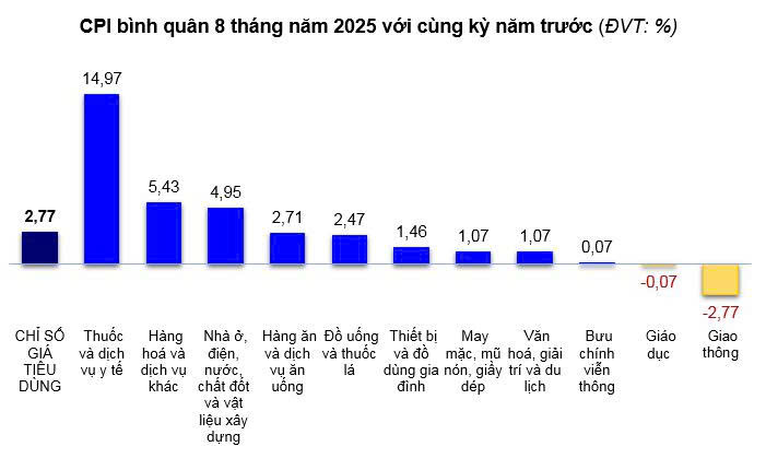 Chỉ số giá tiêu dùng bình quân 8 tháng năm 2025 tăng 2,77% so với bình quân cùng kỳ năm 2024.
