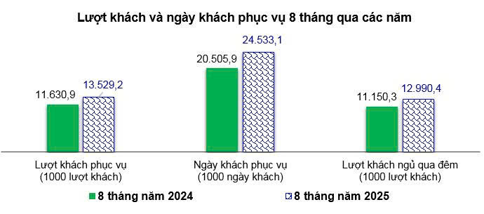 Lượt khách phục vụ trong tháng ước đạt 1.964,4 nghìn lượt, tăng 1,93% so tháng trước và tăng 29,39% so với cùng kỳ năm trước; ngày khách phục vụ ước đạt 3.525 nghìn ngày khách, tăng 2,46% so với tháng trước và tăng 33,5% so với cùng kỳ năm trước. Lũy kế 8 tháng năm 2025 lượt khách ước đạt 13.529,2 nghìn lượt, tăng 16,32% so với cùng kỳ năm trước; ngày khách phục vụ ước đạt 24.533,1 nghìn ngày khách, tăng 19,64% so với cùng kỳ năm trước.