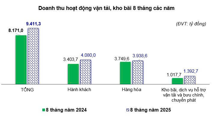 - Doanh thu hoạt động vận tải, kho bãi: Trong tháng ước đạt 1.246,9 tỷ đồng, tăng 2,97% so với tháng trước và tăng 16,3% so với cùng kỳ năm trước. Lũy kế 8 tháng năm 2025 ước đạt 9.411,3 tỷ đồng, tăng 15,18% so với cùng kỳ năm trước. Trong đó: doanh thu vận tải hành khách ước đạt 4.080 tỷ đồng, tăng 19,87% so với cùng kỳ năm trước; doanh thu vận tải hàng hóa ước đạt 3.938,6 tỷ đồng, tăng 5,04%; doanh thu kho bãi, dịch vụ hỗ trợ vận tải ước đạt 1.350,8 tỷ đồng, tăng 37,74%; doanh thu bưu chính, chuyển phát ước đạt 41,8 tỷ đồng, tăng 13,09%.