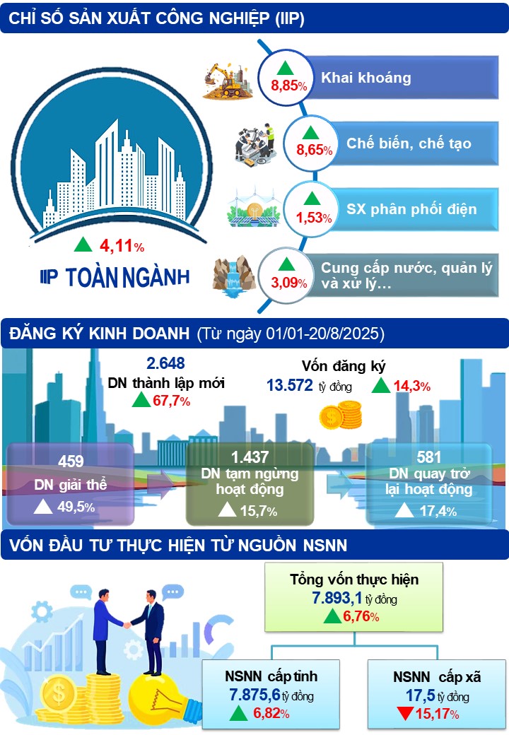 Về phát triển doanh nghiệp: Trong tháng có 655 doanh nghiệp thành lập mới, với số vốn đăng ký 3.138,4 tỷ đồng, tăng 145% về số doanh nghiệp và 152% về vốn đăng ký; 76 doanh nghiệp đăng ký tạm ngừng hoạt động, giảm 3,8%; 95 doanh nghiệp giải thể, tăng 63,8%; 51 doanh nghiệp hoạt động trở lại, tăng 30,7% so cùng kỳ. Lũy kế 8 tháng năm 2025, có 2.648 doanh nghiệp thành lập mới, tăng 67,7% so với cùng kỳ; vốn đăng ký 13.572 tỷ đồng, tăng 14,3% so với cùng kỳ; 1.437 doanh nghiệp đăng ký tạm ngừng hoạt động, tăng 15,7%; 459 doanh nghiệp giải thể, tăng 49,5%; 581 doanh nghiệp hoạt động trở lại, tăng 17,4% so cùng kỳ.