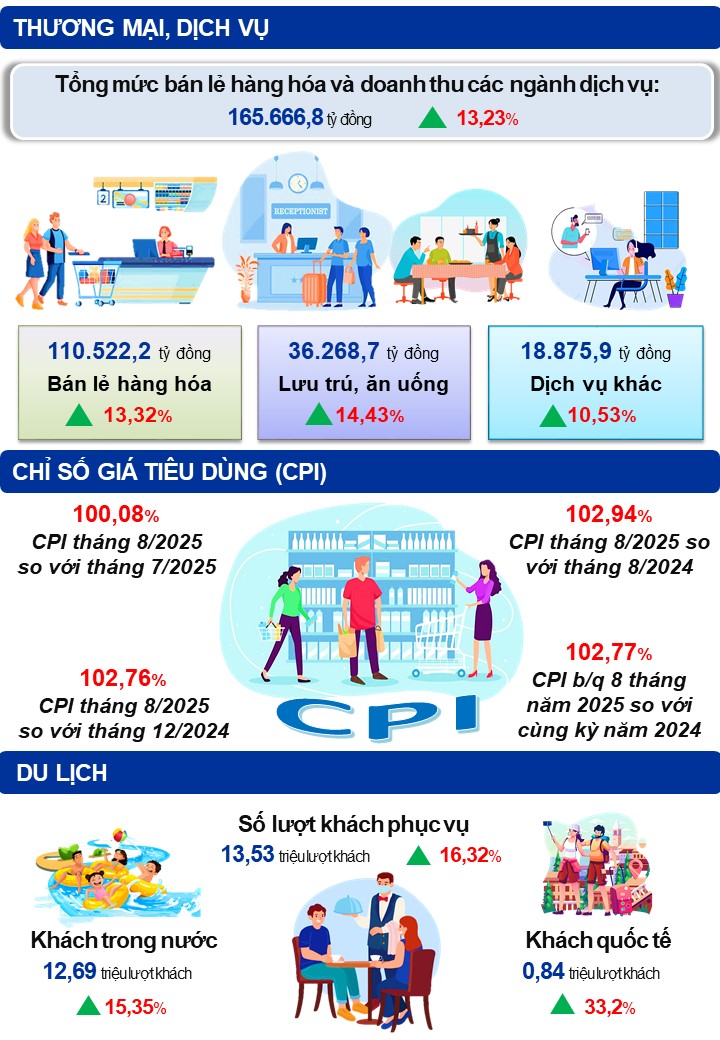 Doanh thu dịch vụ lưu trú trong tháng ước đạt 1.011,5 tỷ đồng, tăng 0,4% so với tháng trước và tăng 26,51% so với cùng kỳ năm trước; dịch vụ ăn uống ước đạt 3.979,3 tỷ đồng, tăng 0,96% so với tháng trước và tăng 17,77% so với cùng kỳ năm trước; du lịch lữ hành ước đạt 32,6 tỷ đồng, giảm 1,61% so với tháng trước và giảm 8,28% so với cùng kỳ năm trước. Lũy kế 8 tháng năm 2025 doanh thu dịch vụ lưu trú đạt 7.041,9 tỷ đồng, tăng 16,57% so với cùng kỳ năm trước; dịch vụ ăn uống đạt 28.802,7 tỷ đồng, tăng 13,28% so cùng kỳ năm trước; du lịch lữ hành đạt 424,1 tỷ đồng, tăng 86,38% so cùng kỳ năm trước.