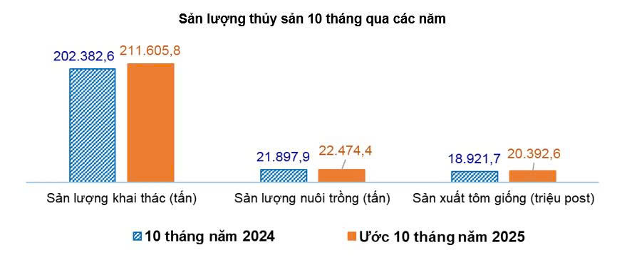 - Khai thác thủy sản: Sản lượng khai thác thủy sản trong tháng ước đạt 23.034 tấn, tăng 3,47% so với cùng kỳ năm trước (sản lượng khai thác thủy sản biển đạt 22.846 tấn, tăng 2,9%). Lũy kế 10 tháng năm 2025, sản lượng khai thác đạt 211.605,8 tấn, tăng 4,56% so với cùng kỳ năm trước (sản lượng khai thác thủy sản biển đạt 210.371,4 tấn, tăng 4,58%).