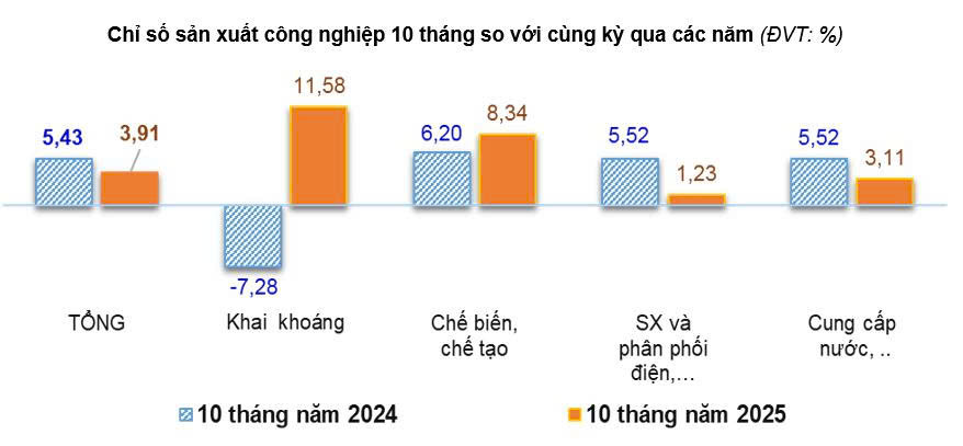 Tính chung 10 tháng năm 2025, ước chỉ số sản xuất toàn ngành công nghiệp tăng 3,91% so với cùng kỳ năm trước. Trong đó ngành công nghiệp khai khoáng tăng 11,58%; ngành công nghiệp chế biến chế tạo tăng 8,34%; ngành sản xuất và phân phối điện, khí đốt, nước nóng, hơi nước và điều hòa không khí tăng 1,23%; ngành cung cấp nước, hoạt động quản lý và xử lý rác thải, nước thải tăng 3,11%.