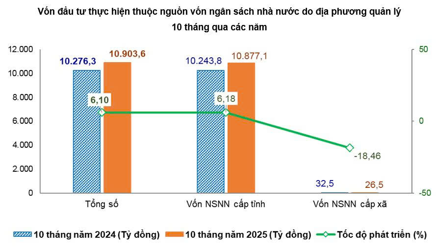 Lũy kế 10 tháng năm 2025, tổng vốn đầu tư thực hiện từ nguồn ngân sách nhà nước do địa phương quản lý ước đạt 10.903,6 tỷ đồng, đạt 68,65% kế hoạch năm và tăng 6,1% so với cùng kỳ. Trong đó: Vốn cấp tỉnh ước đạt 10.877,1 tỷ đồng, tăng 6,18%; vốn cấp xã đạt 26,4 tỷ đồng, giảm 18,38%.