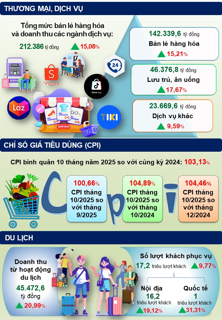 Khu vực dịch vụ là điểm sáng rõ nét nhất. Tổng mức bán lẻ hàng hóa và doanh thu các ngành dịch vụ tăng 15,08% so với cùng kỳ. Hoạt động du lịch phục hồi mạnh thu hút 17,2 triệu lượt khách, tăng 19,77%, trong đó khách quốc tế đạt gần 1 triệu lượt, tăng 31,31%. Vận tải tăng trưởng tốt ở cả hành khách (tăng 12,38%) và hàng hóa (tăng 5,07%). Tài chính - Tín dụng ổn định. Thu ngân sách nhà nước bằng 91,33% kế hoạch năm và tăng 16,22% so với cùng kỳ. Dư nợ cho vay ước đến 31/10 tăng 6,8% so với đầu năm. Lạm phát được kiểm soát, CPI bình quân 10 tháng tăng 3,13%.