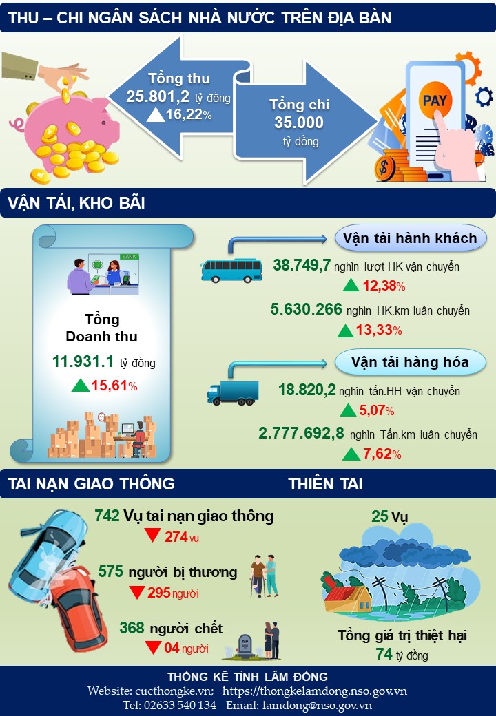 Hoạt động du lịch trong tháng tăng so với tháng trước và so với cùng kỳ năm trước. Trong tháng trên địa bàn tỉnh diễn ra một số sự kiện, hoạt động tiêu biểu như: Lễ hội Katê, Bế mạc tháng trải nghiệm điểm đến du lịch tỉnh Lâm Đồng, Lễ hội khinh khí cầu và nghệ thuật Lâm Đồng, giải quần vợt Vô địch Quốc gia - Cúp Novaworld.... đã thu hút đông đảo người dân và khách du lịch. Hoạt động lữ hành và các dịch vụ hỗ trợ tiếp tục tăng cường phục vụ cho người dân và du khách.