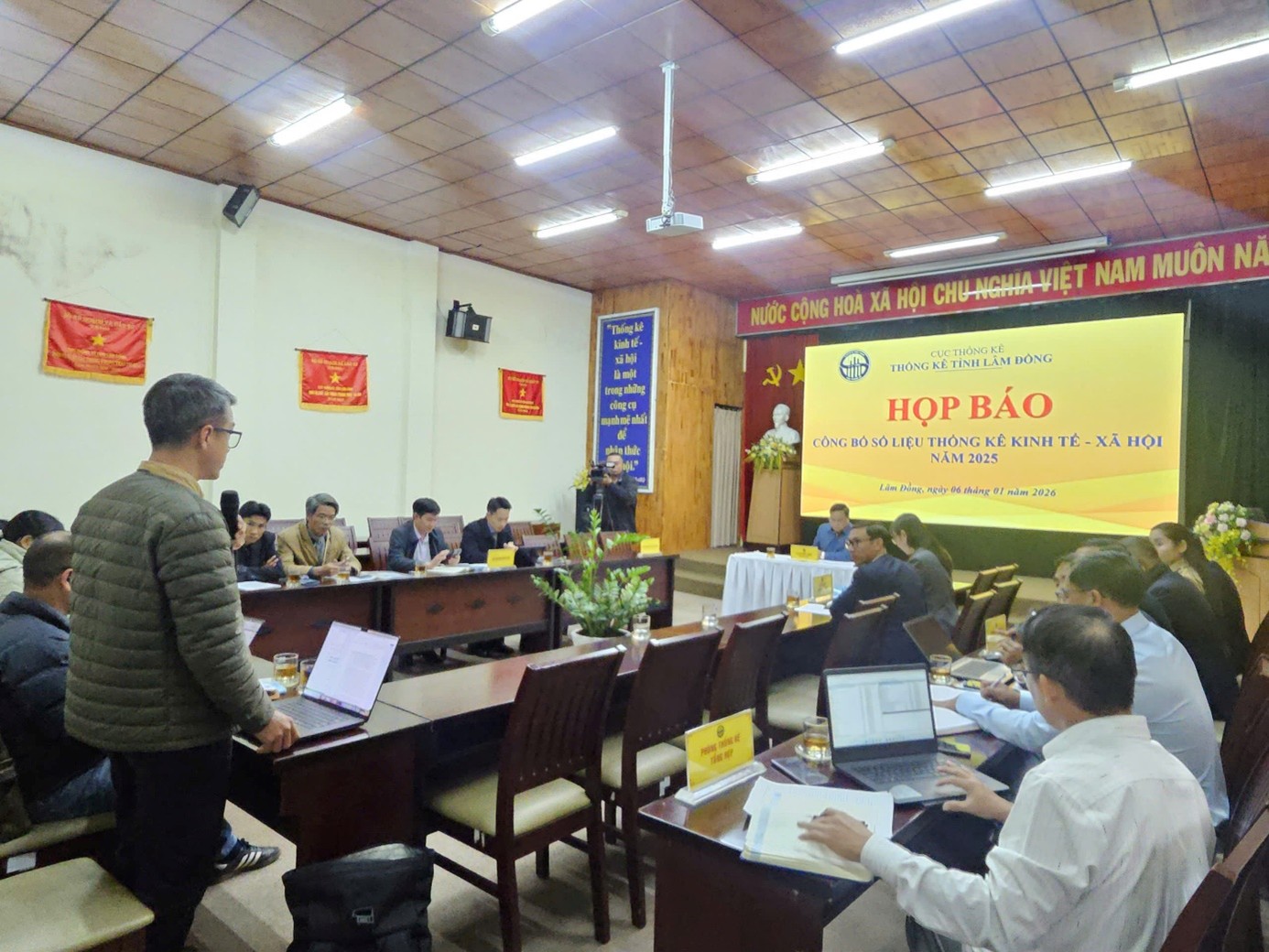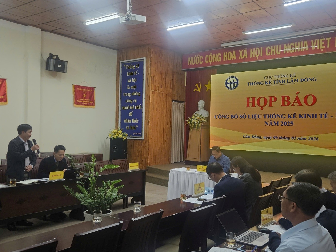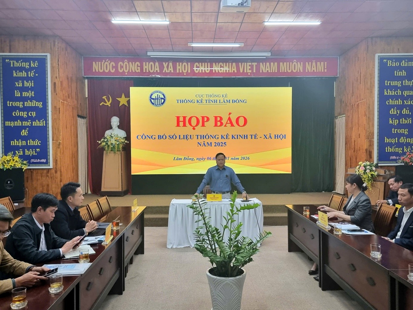 Chiều ngày 06/01/2026, Thống kê tỉnh Lâm Đồng tổ chức họp báo công bố số liệu thống kê kinh tế - xã hội năm 2025. Ông Phạm Quốc Hùng - Trưởng Thống kê tỉnh chủ trì buổi họp báo. Tham dự có các Phó Trưởng Thống kê tỉnh, lãnh đạo các phòng nghiệp vụ, toàn thể công chức phòng Thống kê Tổng hợp thuộc cơ quan Thống kê tỉnh; đại diện Sở Văn hóa, Thể thao và Du lịch, Báo và Phát thanh - Truyền hình Lâm Đồng, Cổng thông tin điện tử UBND tỉnh, cùng đông đảo phóng viên các cơ quan báo chí Trung ương và địa phương thường trú trên địa bàn tỉnh Lâm Đồng.