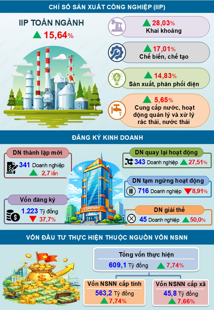 Chỉ số sản xuất toàn ngành công nghiệp (IIP) trong tháng ước giảm 2,67% so với tháng trước và tăng 15,64% so với cùng kỳ năm trước, trong đó: Ngành công nghiệp khai khoáng tăng 28,03% so với cùng kỳ năm trước; ngành công nghiệp chế biến chế tạo tăng 17,01%; ngành sản xuất và phân phối điện, khí đốt, nước nóng, hơi nước và điều hòa không khí tăng 14,83%; ngành cung cấp nước, hoạt động quản lý và xử lý rác thải, nước thải tăng 5,65%.