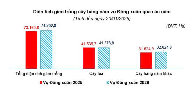 Tiến độ sản xuất cây hàng năm vụ Đông xuân năm 2026 (tính đến ngày 20/01/2026), tổng diện tích gieo trồng toàn tỉnh ước đạt 74.202,8 ha, tăng 1,42% so với vụ Đông xuân năm trước. Trong đó: Lúa diện tích ước đạt 41.378,8 ha, giảm 0,38% so với cùng kỳ năm trước (diện tích gieo trồng lúa giảm chủ yếu do vụ Đông xuân năm nay xuống giống muộn tại xã Trà Tân và xã Hoài Đức); cây ngô, diện tích ước đạt 3.914,4 ha, tăng 1,17%; rau các loại, diện tích ước đạt 21.218,1 ha, tăng 4,51%; hoa các loại, diện tích ước đạt 2.499,5 ha, tăng 2,60%; đậu các loại, diện tích ước đạt 1.306,2 ha, tăng 3,74%; cây hàng năm còn lại, diện tích ước đạt 3.885,8 ha, tăng 3,43%. Nhìn chung tiến độ gieo trồng vụ Đông xuân ổn định so với cùng kỳ năm trước do thời tiết trong vụ thuận lợi, người dân xuống giống gieo trồng đúng lịch thời vụ.