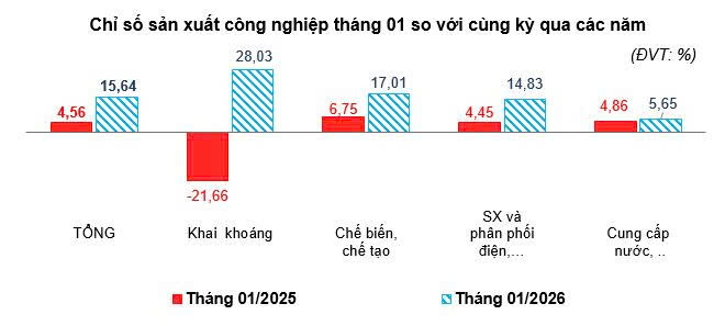 Sản xuất công nghiệp trong tháng tiếp tục duy trì đà tăng trưởng tích cực, chỉ số sản xuất toàn ngành công nghiệp (IIP) tăng 15,64% so với cùng kỳ năm trước; trong đó, ngành công nghiệp khai khoáng tăng 28,03%, ngành công nghiệp chế biến chế tạo tăng 17,01%.
