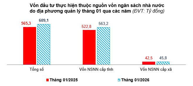 Chi ngân sách nhà nước trên địa bàn tỉnh trong tháng 01/2026 ước đạt 3.000 tỷ đồng, bằng 6,15% dự toán năm. Trong đó: chi đầu tư phát triển ước đạt 300 tỷ đồng, bằng 2,27% dự toán năm; chi thường xuyên ước đạt 2.500 tỷ đồng, bằng 8,24% dự toán năm.