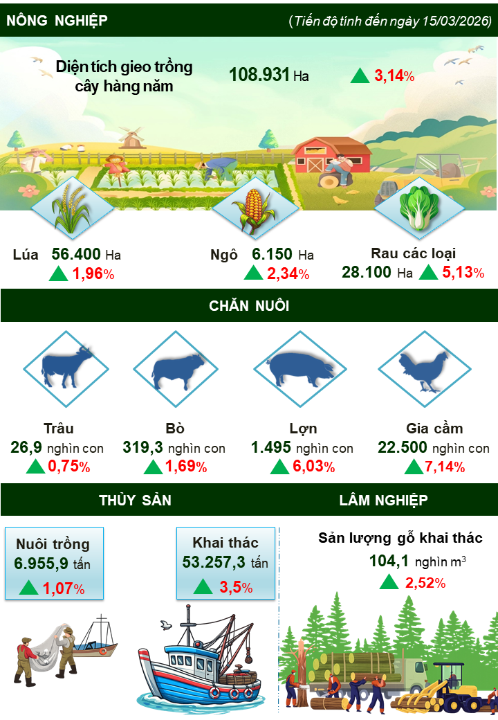 Quý I năm 2026, tình hình sản xuất nông, lâm nghiệp và thủy sản trên địa bàn tỉnh tiếp tục duy trì xu hướng tăng trưởng ổn định, đồng thời thể hiện rõ sự chuyển dịch cơ cấu theo hướng nâng cao hiệu quả và giá trị gia tăng. Vụ Đông xuân được triển khai đúng lịch thời vụ, bảo đảm tiến độ; các địa phương chú trọng chuyển đổi cơ cấu cây trồng, áp dụng kỹ thuật mới và tăng cường phòng chống dịch bệnh; diện tích gieo trồng các loại cây hàng năm hầu hết tăng so với cùng kỳ; sản xuất nông nghiệp theo hướng công nghệ cao tiếp tục được chú trọng. Chăn nuôi duy trì đà tăng trưởng ổn định, quy mô đàn gia súc, gia cầm đều tăng so với cùng kỳ. Tình hình dịch bệnh trên cây trồng, vật nuôi cơ bản được kiểm soát, không xảy ra dịch lớn trên diện rộng. Hoạt động lâm nghiệp chủ yếu tập trung vào công tác bảo vệ rừng, phòng chống cháy rừng và ươm cây giống lâm nghiệp. Khai thác thủy sản tiếp tục tăng trưởng về sản lượng nuôi trồng và khai thác, góp phần đảm bảo nguồn cung trong nước và xuất khẩu. Tuy nhiên, ngành nông nghiệp vẫn còn gặp nhiều khó khăn do tăng giá xăng, dầu làm gia tăng chi phí đầu vào, chi phí vận chuyển và giá vật tư nông nghiệp, ảnh hưởng trực tiếp đến hiệu quả sản xuất và thu nhập của người dân.