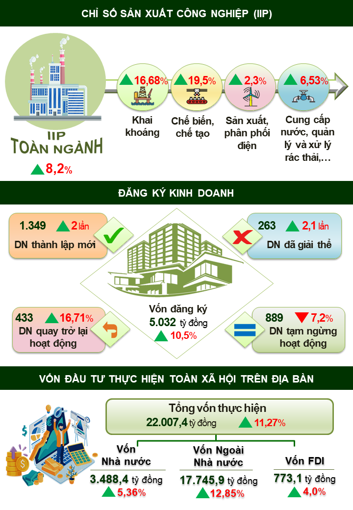 Chỉ số sản xuất toàn ngành công nghiệp (IIP) trong tháng ước tăng 43,32% so với tháng trước và tăng 11,4% so với cùng kỳ năm trước. Trong đó, ngành công nghiệp khai khoáng tăng 0,2%; ngành công nghiệp chế biến chế tạo tăng 27,3%; ngành sản xuất và phân phối điện, khí đốt, nước nóng, hơi nước và điều hòa không khí tăng 5,6%; ngành cung cấp nước, hoạt động quản lý và xử lý rác thải, nước thải tăng 10,72%.