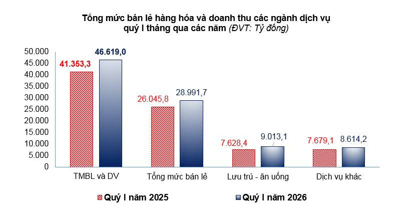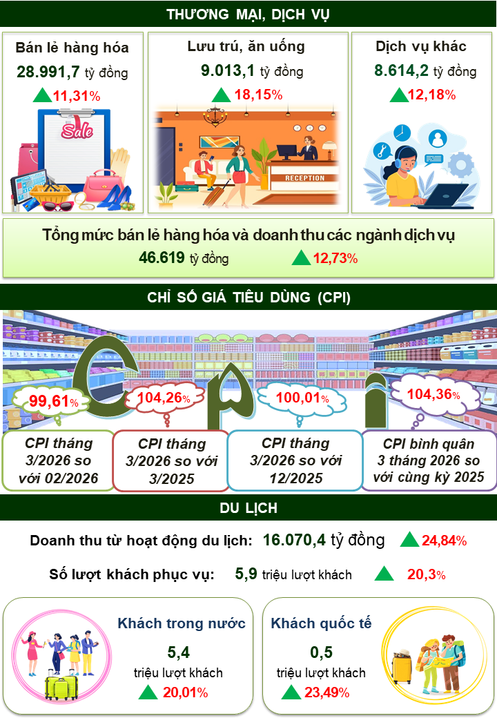 Doanh thu dịch vụ lưu trú trong tháng ước đạt 570,2 tỷ đồng, giảm 8,32% so với tháng trước và tăng 15,18% so với cùng kỳ năm trước; dịch vụ ăn uống ước đạt 2.209,3 tỷ đồng, giảm 9,05% so với tháng trước và tăng 12,39% so với cùng kỳ năm trước; du lịch lữ hành ước đạt 45,4 tỷ đồng, giảm 9,38% so với tháng trước và tăng 26,82% so với cùng kỳ năm trước. Quý I năm 2026 doanh thu dịch vụ lưu trú đạt 1.886,8 tỷ đồng, tăng 20,77% so với cùng kỳ năm trước; dịch vụ ăn uống đạt 6.980,5 tỷ đồng, tăng 17,25% so với cùng kỳ năm trước; dịch vụ lữ hành đạt 145,8 tỷ đồng, tăng 29,6% so với cùng kỳ năm trước.