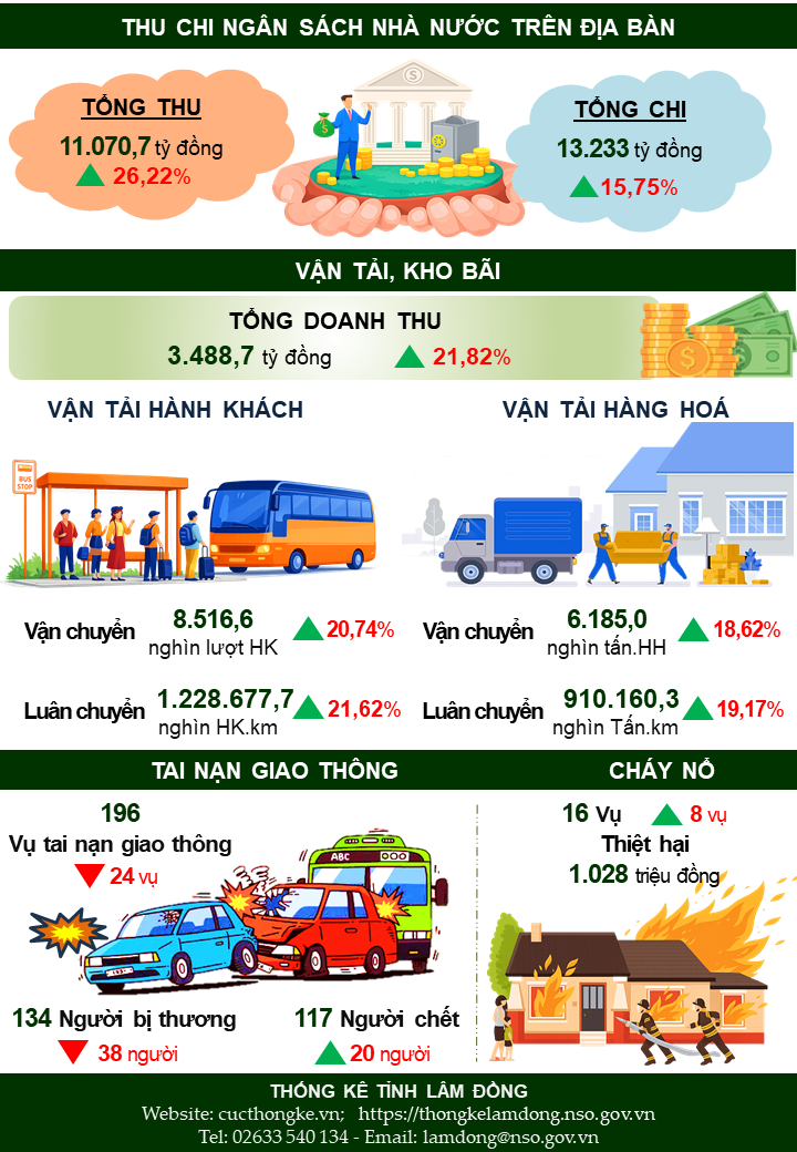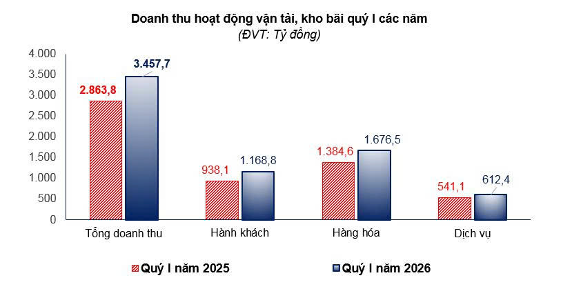 - Doanh thu hoạt động giao thông vận tải, kho bãi trong tháng ước đạt 1.184,1 tỷ đồng, giảm 1,53% so với tháng trước và tăng 26,14% so với cùng kỳ năm trước. Quý I năm 2026 ước đạt 3.488,7 tỷ đồng, tăng 21,82% so với cùng kỳ năm trước. Trong đó doanh thu vận tải hành khách ước đạt 1.189,8 tỷ đồng, tăng 26,83% so với cùng kỳ năm trước; doanh thu vận tải hàng hóa ước đạt 1.706,5 tỷ đồng, tăng 23,25% so với cùng kỳ năm trước; doanh thu kho bãi, dịch vụ hỗ trợ vận tải ước đạt 455,2 tỷ đồng, tăng 11,3% so với cùng kỳ năm trước; doanh thu bưu chính, chuyển phát ước đạt 137,2 tỷ đồng, tăng 3,86% so với cùng kỳ năm trước.