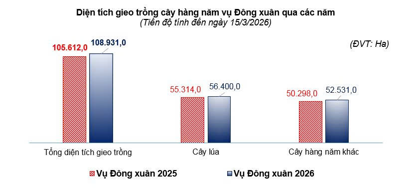 Vụ Đông xuân 2026, nhằm phát huy hiệu quả sử dụng đất, tăng cường tiết kiệm nguồn nước tưới và hạn chế sâu bệnh, người dân đã chuyển đổi sang cây trồng khác trên đất trồng lúa với diện tích 1.870 ha. Tính đến ngày 15/3/2026, tổng diện tích gieo trồng vụ Đông xuân ước đạt 108.931 ha, tăng 3,14% so với vụ Đông xuân năm trước. Trong đó: Lúa diện tích ước đạt 56.400 ha, tăng 1,96% so với cùng kỳ năm trước; cây ngô, diện tích ước đạt 6.150 ha, tăng 2,34%; cây khoai lang, diện tích ước đạt 2.250 ha, tăng 2,86%; cây đậu các loại diện tích ước đạt 2.750 ha, tăng 2,14%; cây lạc, diện tích ước dạt 1.400 ha, tăng 3,33%; cây rau các loại, diện tích ước đạt 28.100 ha, tăng 5,13%; hoa các loại, diện tích ước đạt 4.450 ha, tăng 4,90%,... Sản xuất rau và hoa trên địa bàn tỉnh ngày càng chuyển mạnh sang hướng nông nghiệp công nghệ cao, ứng dụng nhà kính, nhà lưới, hệ thống tưới tự động và các quy trình sản xuất an toàn như VietGAP, GlobalGAP; nhờ đó năng suất, chất lượng và giá trị sản phẩm được nâng cao, nhiều sản phẩm rau của tỉnh đã tham gia vào chuỗi cung ứng cho các hệ thống siêu thị, doanh nghiệp chế biến và thị trường xuất khẩu.