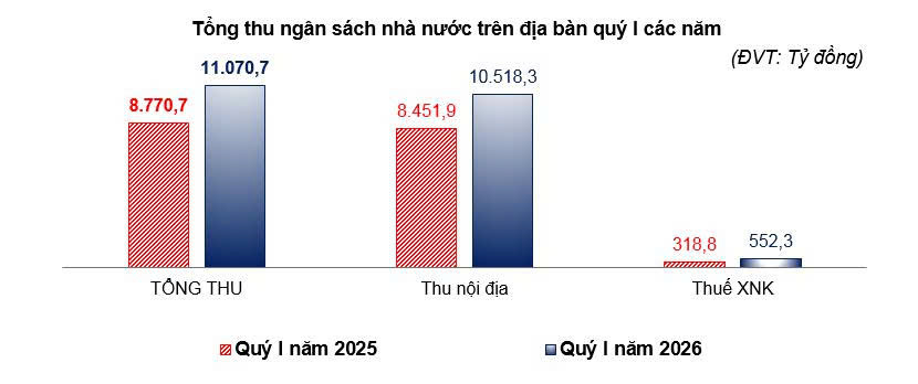 Tổng thu ngân sách nhà nước trên địa bàn tỉnh trong tháng ước đạt 2.906 tỷ đồng, tăng 33,74% so với tháng trước và tăng 7,96% so với cùng kỳ năm trước. Quý I năm 2026 ước đạt 11.070,7 tỷ đồng, bằng 32,15% kế hoạch năm và tăng 26,22% so với cùng kỳ năm trước, trong đó: thu nội địa ước đạt 10.518,3 tỷ đồng, bằng 30,82% kế hoạch năm và tăng 24,45%; thu cân đối ngân sách từ hoạt động xuất, nhập khẩu ước đạt 552,3 tỷ đồng, bằng 31,38% kế hoạch năm và tăng 73,24% so với cùng kỳ năm trước.