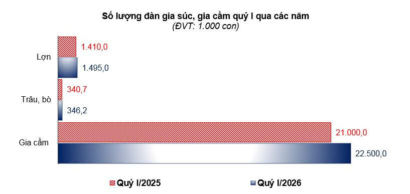 Trong quý, hoạt động chăn nuôi trên địa bàn tỉnh tiếp tục duy trì ổn định và có xu hướng tăng ở hầu hết các vật nuôi chủ lực. Tổng đàn gia súc, gia cầm tăng so với cùng kỳ năm trước, góp phần bảo đảm nguồn cung thực phẩm phục vụ nhu cầu tiêu dùng của người dân. Sản lượng thịt hơi các loại ước tính tháng 3/2026 đạt 34.999,1 tấn, tăng 12,3% so với cùng kỳ năm trước; quý I năm 2026 ước đạt 93.228,7 tấn, tăng 9,84%.