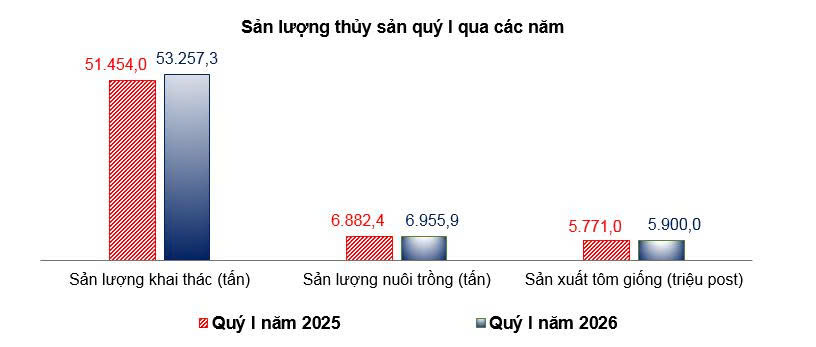 - Khai thác thủy sản: Những tháng đầu năm, tình hình thời tiết và ngư trường tương đối thuận lợi, tàu thuyền bám biển hoạt động khai thác ổn định; nguồn lợi cá cơm xuất hiện khá dày tạo điều kiện cho các tàu nghề vây cá nổi nhỏ, nghề pha xúc đánh bắt. Ngư trường khai thác chủ yếu tập trung tại vùng lộng trong tỉnh, khu vực phía nam đảo Phú Quý, Côn Sơn,... Sản lượng khai thác thủy sản trong tháng ước đạt 16.209,6 tấn, tăng 3,02% so với cùng kỳ năm trước (sản lượng khai thác thủy sản biển đạt 16.159 tấn, tăng 3,02%); quý I năm 2026 ước đạt 53.257,3 tấn, tăng 3,5% (sản lượng khai thác biển đạt 53.109 tấn, tăng 3,5%).