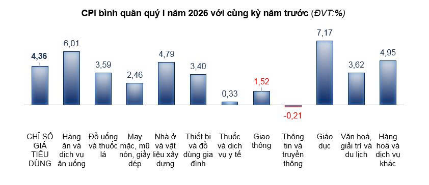 - Nguyên nhân tăng CPI bình quân quý I năm 2026: Chỉ số giá nhóm lương thực tăng 2,82% làm CPI chung tăng 1,15 điểm phần trăm, trong đó tăng do giá gạo trong nước tăng theo giá gạo xuất khẩu và nhu cầu tiêu dùng gạo nếp và gạo tẻ ngon trong dịp Lễ ông Công, ông Táo và Tết Nguyên đán tăng cao làm cho giá gạo quý I/2026 tăng 1,50% so với cùng kỳ năm trước; Chỉ số giá nhóm thực phẩm tăng 6,78% làm CPI chung tăng 1,64 điểm phần trăm, trong đó chỉ số giá nhóm thịt lợn tăng mạnh 10,72%; giá thịt gia cầm tăng 7,15%, so cùng kỳ tăng do thiếu hụt nguồn cung trong khi nhu cầu tiêu dùng tăng cao trong các dịp Lễ, Tết; Chỉ số giá nhóm hàng ăn uống ngoài gia đình tăng 5,75%, do giá lương thực thực phẩm đang mức tăng cao so cùng kỳ, giá gas, giá thuê mặt bằng và nhân công tăng; Chỉ số giá nhóm nhà ở và vật liệu xây dựng tăng 4,79% do giá xi măng, cát, đá tăng theo giá nguyên nhiên vật liệu đầu vào và giá nhà thuê tăng, làm CPI chung tăng 0,86 điểm phần trăm; Chỉ số giá dầu hỏa tăng 12,33% do điều chỉnh giá dầu trong nước tăng theo biến động giá thế giới; Chỉ số giá các mặt hàng đồ uống, thuốc lá tăng 3,59%; hàng may mặc, mũ nón, giày dép tăng 2,46% và các thiết bị đồ dùng gia đình tăng 3,40%, do nhu cầu tiêu dùng cao trong dịp Tết, cùng với nguyên liệu đầu vào và chi phí sản xuất tăng nên các nhà cung ứng tăng giá bán sản phẩm; Chỉ số giá nhóm giao thông tăng 1,52% so cùng kỳ năm trước góp phần làm CPI chung tăng 0,17 điểm phần trăm, trong đó giá tăng chủ yếu các mặt hàng nhiên liệu tăng 0,58%, do ảnh hưởng các đợt điều chỉnh giá xăng dầu trong nước; giá dịch vụ giao thông công cộng tăng 16,57% do giá xăng dầu đang mức tăng cao nên các công ty vận tải hành khách tăng giá vé so cùng kỳ năm trước; Chỉ số giá nhóm giáo dục tăng 7,17%, làm CPI chung tăng 0,34 điểm phần trăm do một số trường đại học, trung học dân lập, mầm non tư thục điều chỉnh tăng học phí thường niên.